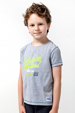 Футболка из эластичного хлопкового трикотажа. Изделие декорировано отделочными строчками контрастного цвета, принтом и текстильной нашивкой.