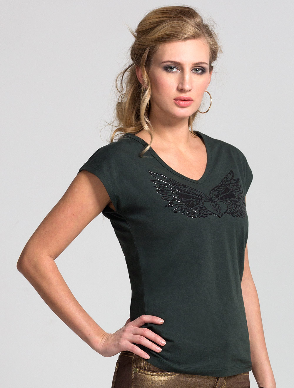 Описание: Футболка полуприлегающего силуэта с цельнкройным рукавом. Спереди выполнен принт в виде крыльев орла и украшен крупными, прямоугольными стразами черного цвета.