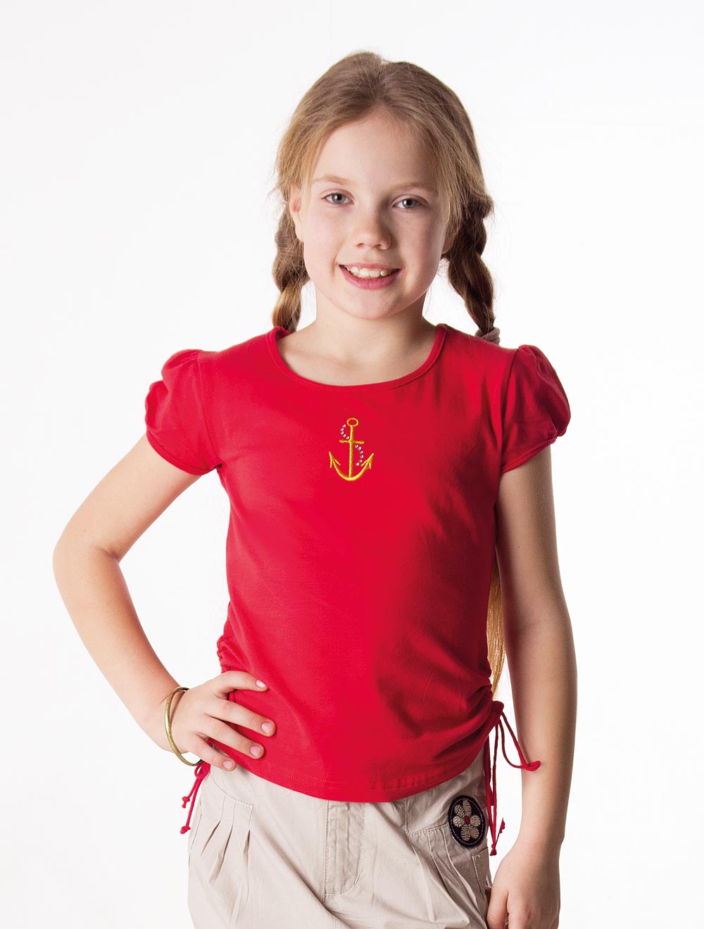 Описание: Футболка из хлопкового эластичного трикотажа. Боковые швы по низу собираются завязками. На груди вышивка в виде якоря со стразами.
