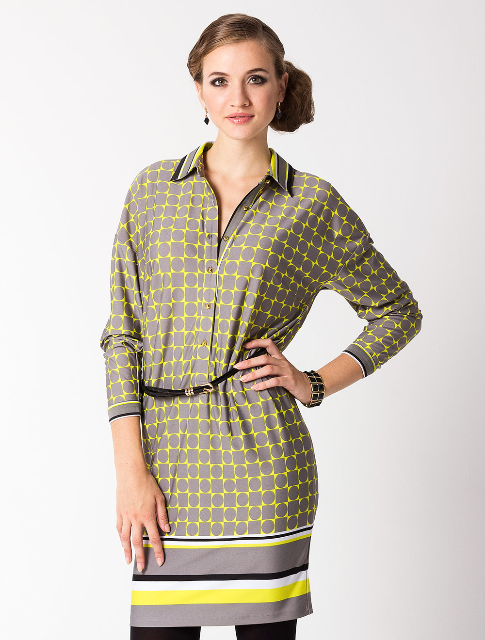 Описание: Трикотажное синтетическое полотно средней плотности, гибкое и хорошо драпируемое. Платье прямого силуэта, верхняя часть повторяет силуэт классической рубашки, который дополнен актуальной формой спущенной проймы. Пуговицы в виде золотистых пирамидок. В больших размерах платье по колено.