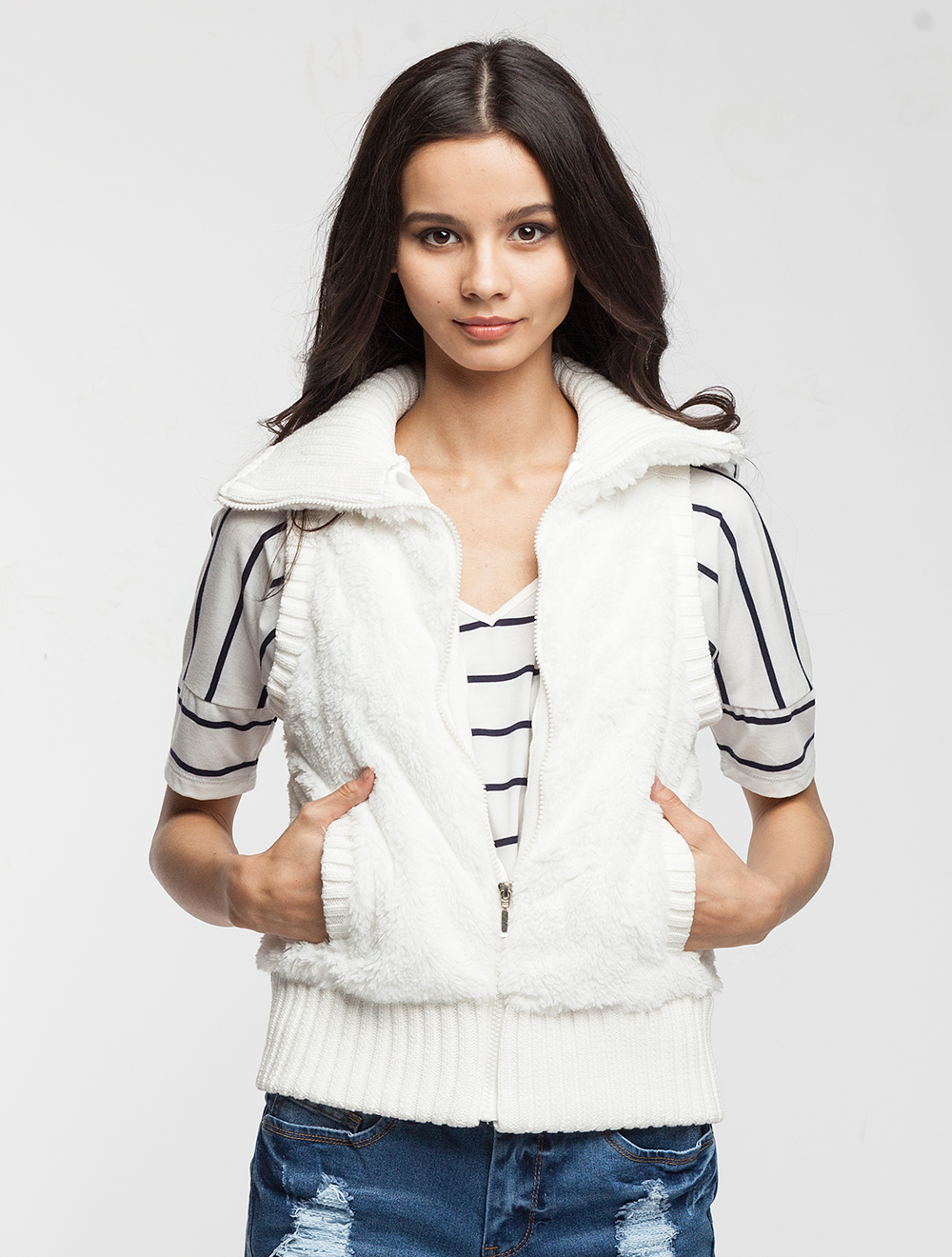 Описание: Жилет из мягкого иск меха. Подвязы крупной вязки из хлопка. Подкладка из атласной ткани. Застежка на молнию.