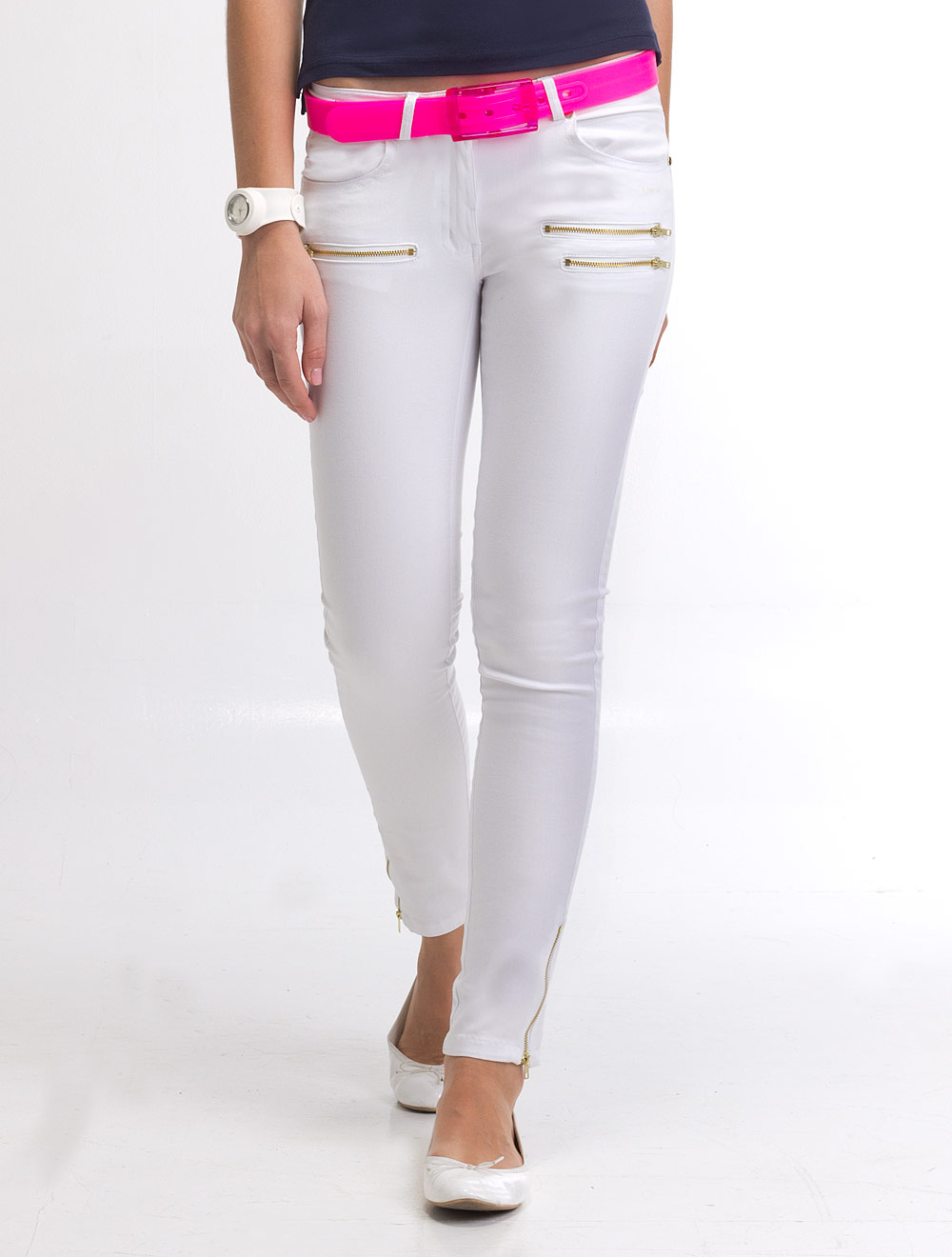Описание: Эластичное плотное хлопковое полотно с сатиновым переплетением. Декоративные джинсовые отстрочки в тон изделия. Передняя часть и низ брюк украшены металлическими молниями золотистого цвета.