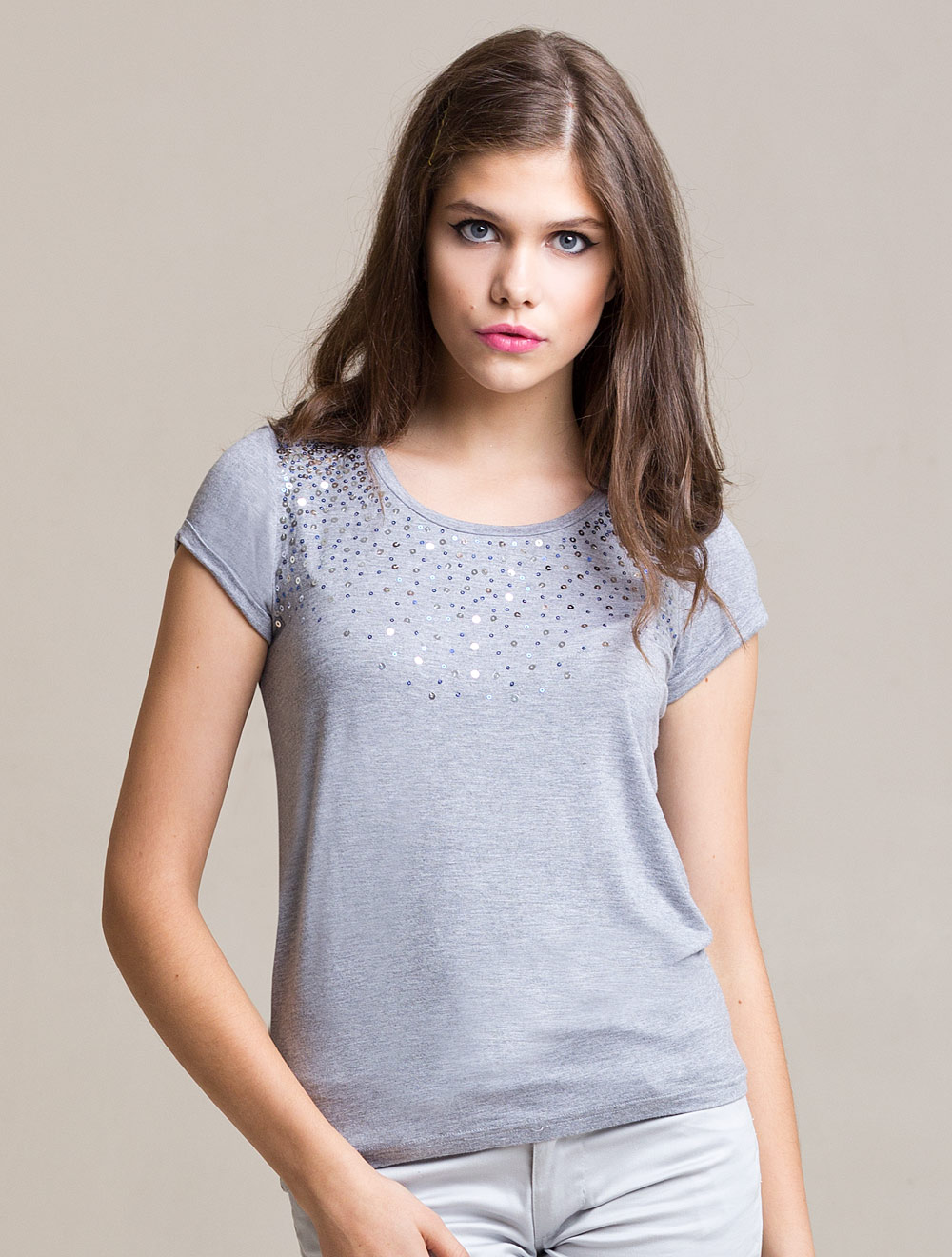 Описание: Футболка из тонкого вискозного трикотажа. Спереди расшита пайетками. Рукава с отгибающимися манжетами.
