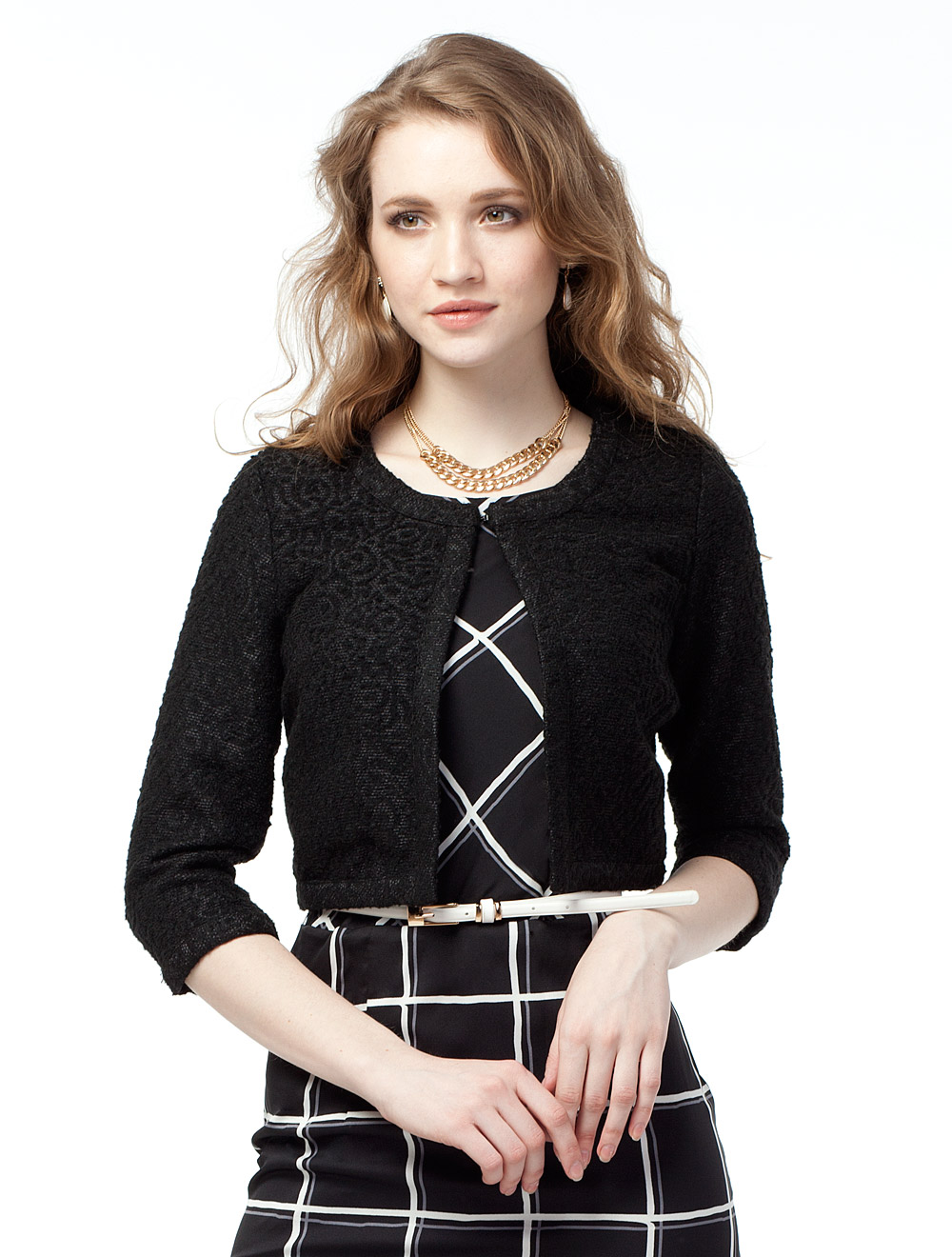 Описание: Плотная костюмная ткань с фактурным рисунком, имитирующим кружево. Сверху застежка на крючок. Края жакета обработаны обтачками.