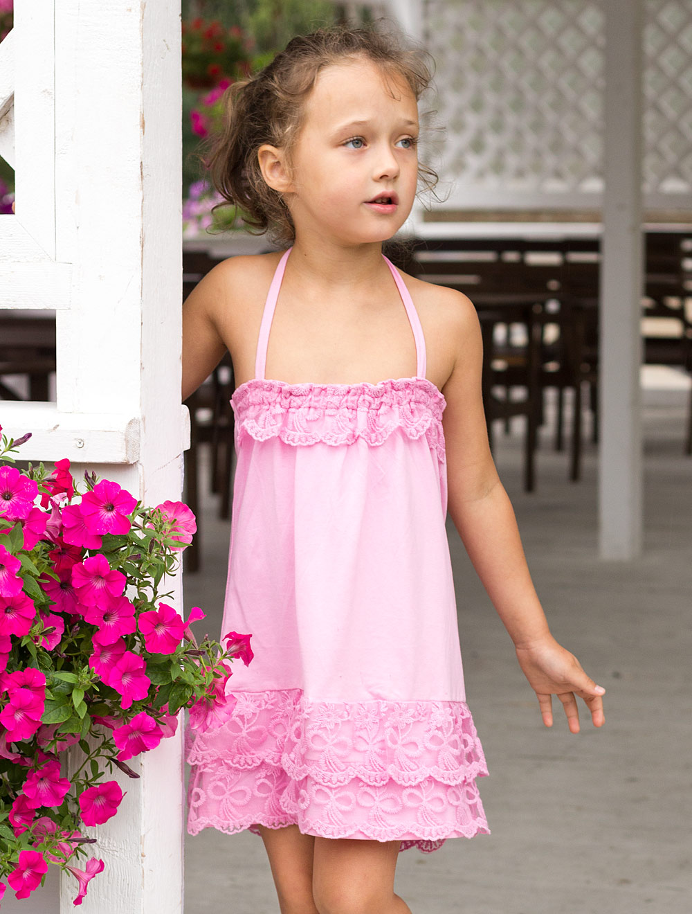 Описание: Сарафан из хлопкового трикотажа с кружевными воланами.