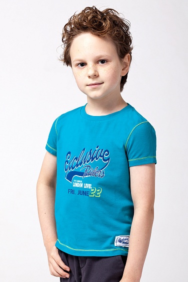 Футболка из эластичного хлопкового трикотажа. Изделие декорировано отделочными строчками контрастного цвета, принтом и текстильной нашивкой.