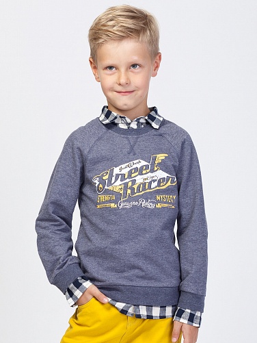 Джемпер из мягкого футера с деталями из ткани в клеточку, имитирующими сорочку. На груди принт.