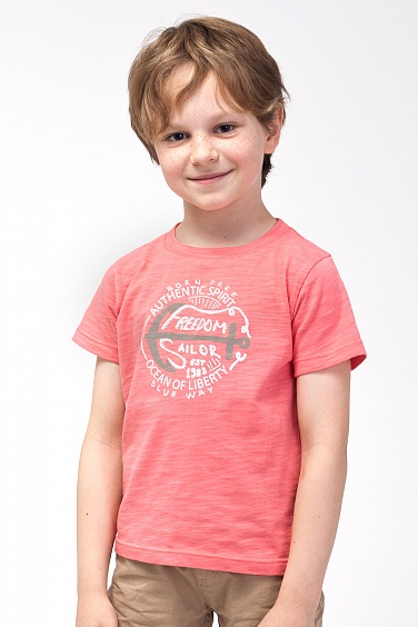 Футболка из фактурного хлопкового трикотажа. Изделие декорировано принтом.