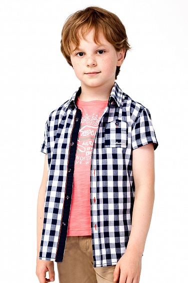 Рубашка для мальчика из хлопковой ткани с эффектом стирки. Изделие декорировано деталями из ткани контрастного цвета и отделочными строчками контрастного цвета. На кармане принт и вышивка.