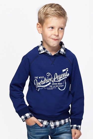 Джемпер из мягкого футера с деталями из ткани в клеточку, имитирующими сорочку. На груди принт.