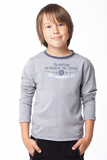 Футболка их хлопкового трикотажа с принтом на груди. Горловина с открытым срезом контрастного цвета.