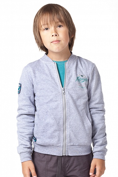 Жакет для мальчика из футера, декорированной принтом на груди и нашивками на рукаве и по низу изделия.