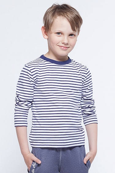 Футболка из полосатого хлопкового трикотажа с контрастной отделочной строчкой по плечам и горловине спинки.