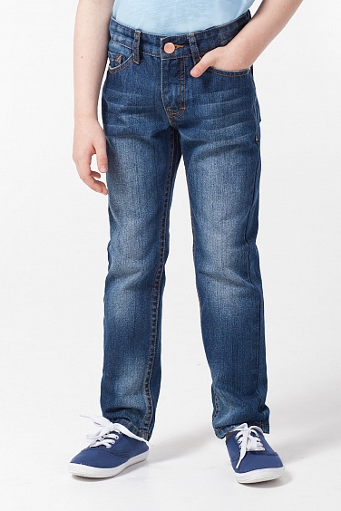 Классические джинсы с эффектом стирки и потертостями. Декоративная строчка контрастного цвета.