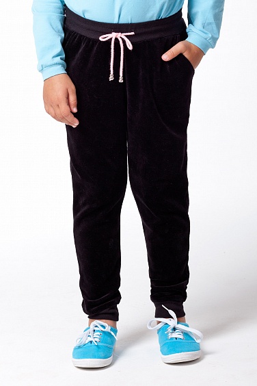 Брюки из хлопкового велюра с рибаной и шнурком на поясе, с удобными боковыми карманами. По низу брюк рибана.