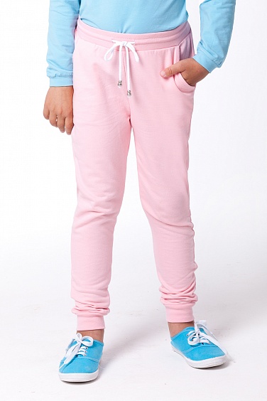 Брюки из двухниточного футера с рибаной и шнурком на поясе, с удобными боковыми карманами. По низу брюк рибана.