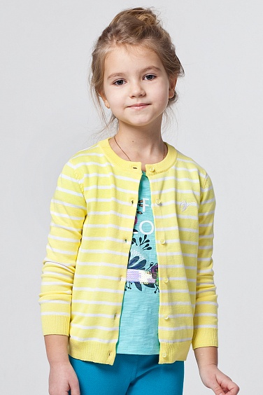 Жакет из мягкой хлопковой пряжи. Спереди застежка на пуговицы. На груди вышивка нитками контрастного цвета.