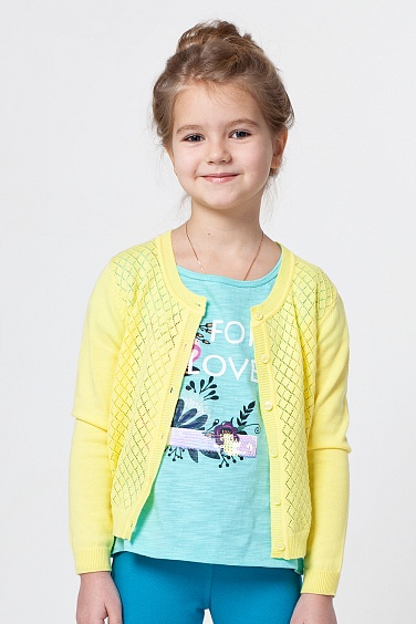 Жакет из мягкой хлопковой пряжи. Перед выполнен ажурной вязкой. Застежка на пуговицы.