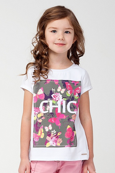 Футболка свободного кроя из тонкого хлопкового трикотажа с небольшими разрезами по низу боковых швов. Перед декорирован принтом и металлической нашивкой золотистого цвета с логотипом.