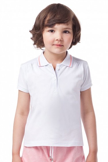 Поло из полотна пике со сборкой на плечах. По краю воротника - полоса контрастного цвета. Верхняя пуговица пришита нитками контрастного цвета.