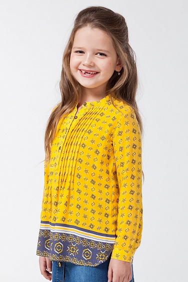Блузка из тонкой вискозной ткани с принтом. Спереди и на манжетах рукавов застежка на пуговицы. Фигурный вырез низа изделия. Передняя часть блузки декорирована узкими застроченными складками.