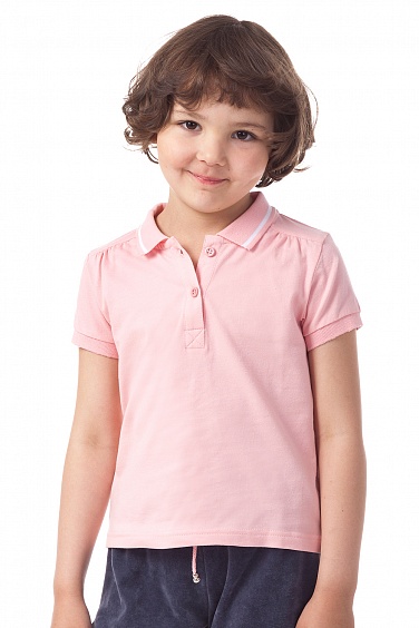 Поло из полотна пике со сборкой на плечах. По краю воротника - полоса контрастного цвета. Верхняя пуговица пришита нитками контрастного цвета.