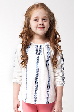 Футболка свободного кроя из тонкого хлопкового трикотажа. Под горловиной сборка. Низ рукавов собран на резинку. Перед изделия и рукава декорированы принтом, имитирующим вышивку. Спереди под горловиной небольшой вырез.