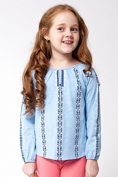 Футболка свободного кроя из тонкого хлопкового трикотажа. Под горловиной сборка. Низ рукавов собран на резинку. Перед изделия и рукава декорированы принтом, имитирующим вышивку. Спереди под горловиной небольшой вырез.