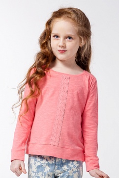 Футболка для девочки выполнена из тонкого хлопкового фактурного трикотажного полотна. Перед декорирован хлопковым кружевом в тон изделия. По плечам небольшая сборка.