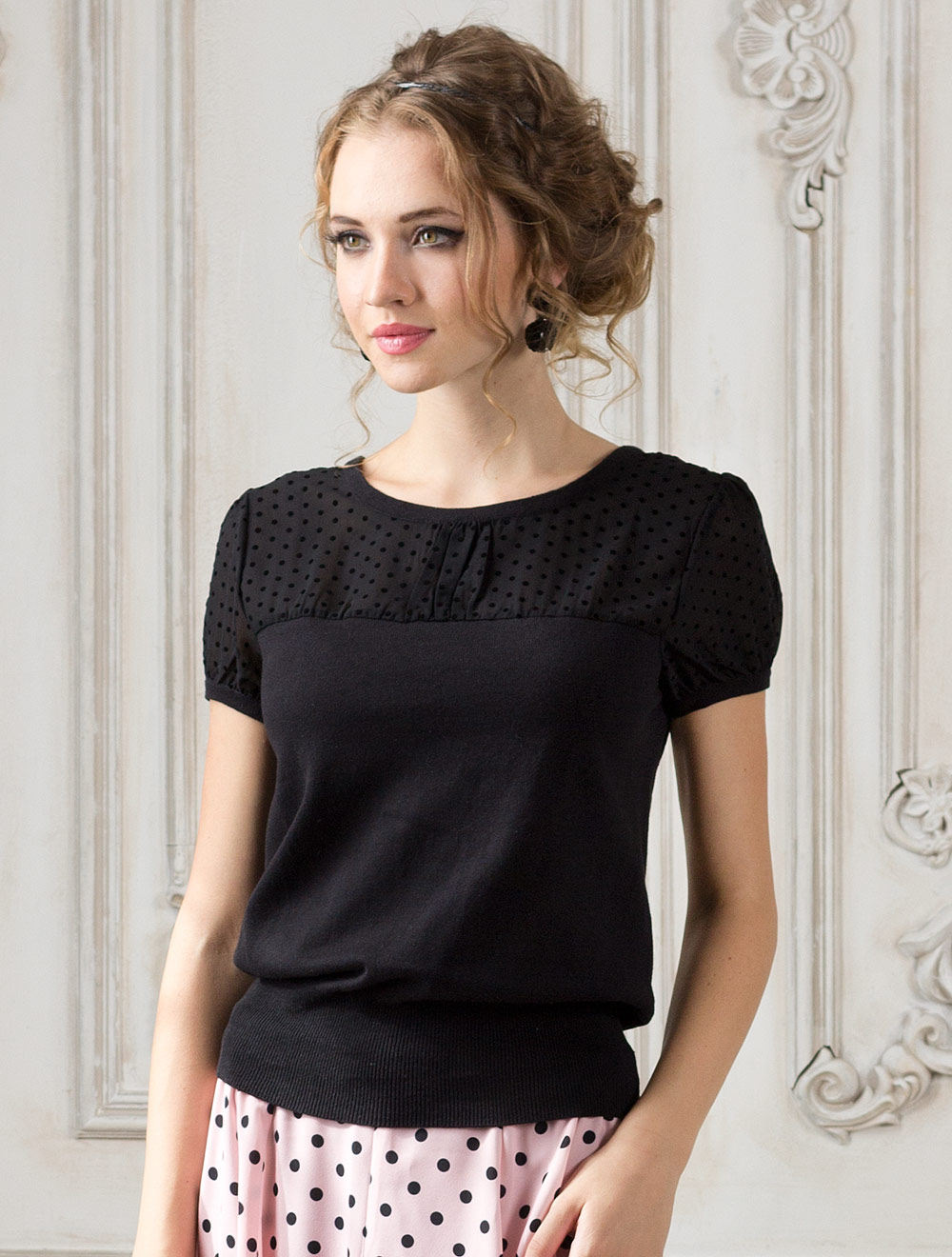 Описание: Перед и спинка выполнены из тонкой хлопоковой вязки. Верхняя часть и рукава-фонарики из шифона с нанесением мелкий горошек бархатной фактуры.
