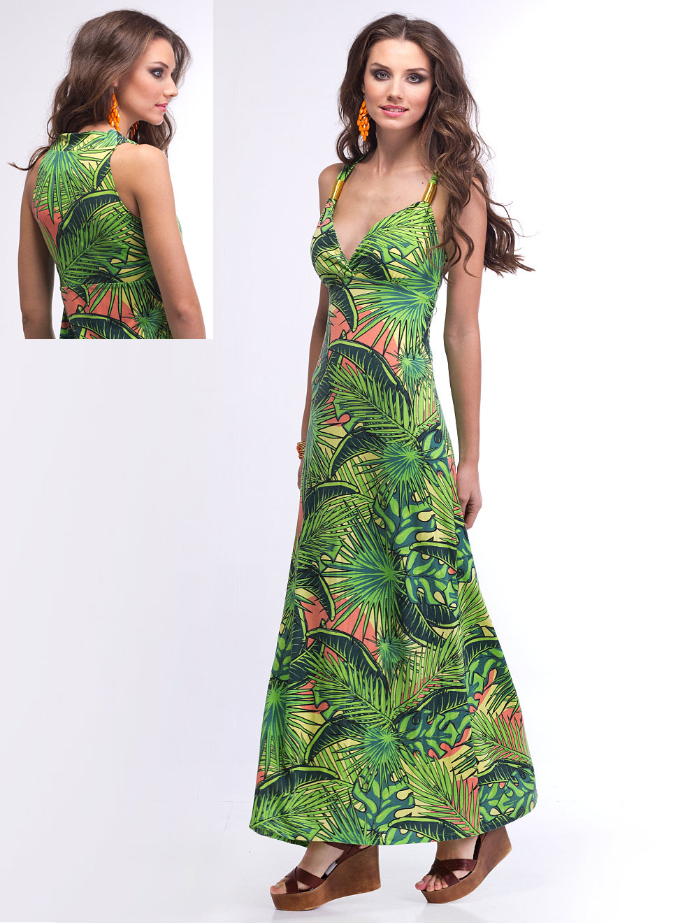 Описание: Отличная посадка данного платья достигается за счет из плотного и утяжеленного трикотажного полотна с "тропическим" принтом, а также за счет наличия "чашек" на груди, широкие бретели украшены золотистыми цилиндрическими элементами. Без подкладки.
