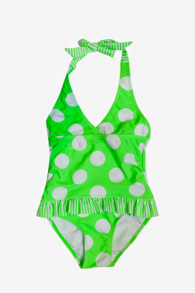купальник слитный 80%nylon 20%spandex 190gsm Купальник слитный. Модель с оборками на поясе. Принт крупный горошек. зеленый 92-98-104-110-116-122 (6 р-ров) 620 / Новая цена - 300