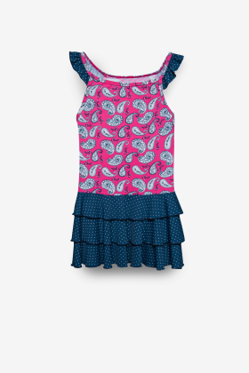 Сарафан 80%nylon 20%spandex 190gsm Сарафан. Юбка изделия выполнена рюшами. Принт пейсли и мелкая крапинка. огурцы 110-116-122-128-134-140 (6 р-ров) 770 / Новая цена - 300