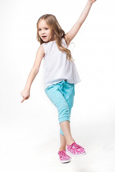 Капри для девочки из хлопкового трикотажного полотна- бамбу. Боковые карманы отстрочены серебристым люрексом.