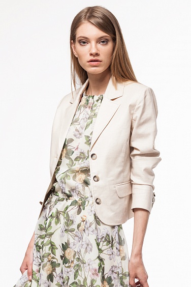 Жакет из льняной ткани, обработанной специальной пропиткой , которая придает ткани глянцевый эффект и предотвращает сильную сминаемость. Классический покрой, спереди рельефы, карманы с клапаном. На рукаве шлица с четырьмя отделочными пуговицами. Жакет без подкладки, основные припуски швов внутри окантованы атласной лентой бежево-золотого цвета. Подплечники из поролона скрыты широкой обтачкой и подбортом. По лацкану и воротнику отделочная строчка в цвет ткани.