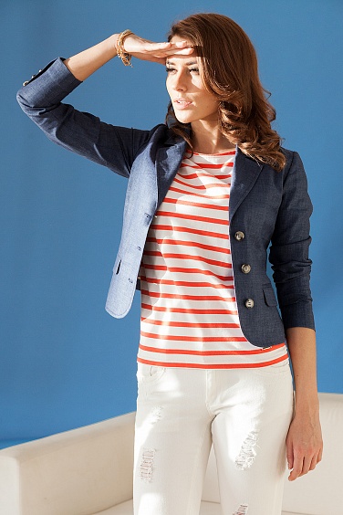 Жакет женский из льняной ткани, обработанной специальной пропиткой , которая придает ткани глянцевый эффект и предотвращает сильную сминаемость. Классический покрой, спереди рельефы, карманы с клапаном. На рукаве шлица с четырьмя отделочными пуговицами. Жакет без подкладки, основные припуски швов внутри окантованы атласной лентой бежево-золотого цвета. Подплечники из поролона скрыты широкой обтачкой и подбортом. По лацкану и воротнику отделочная строчка в цвет ткани.