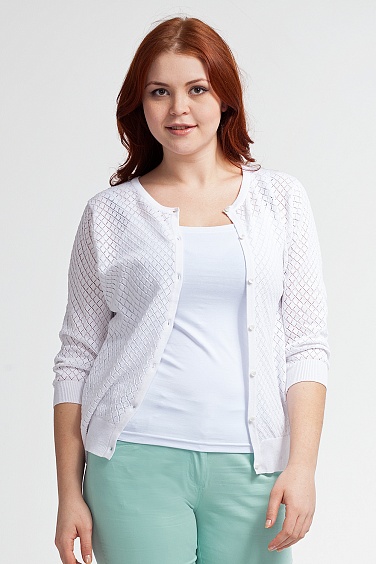 Жакет вязаный из хлопковой пряжи. Ажурная вязка ромбами. По горловине и борту вязаная обтачка с петлями и пуговицами. Низ связан широкой резинкой.