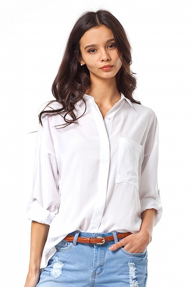 Блуза из вискозного штапельного полотна. Свободный покрой, спущенное плечо. На спинке широкая кокетка с отстроченной квадратом складкой по центру спинки. На рукаве пата, которая позволяет регулировать длину. Воротник отложной на стойке. На груди накладной карман. Удлиненная спинка, боковые швы заканчиваются разрезами.