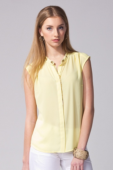 Блузка выполнена из тонкого крепового атласа. Супатная застежка на пуговицы. На верхней стойке люверсы в которые продета золотистая цепь с прямоугольными подвесками на концах. Цепь не прилегает к шее, она проходит внутри стойки. На плечах двойная кокетка, переходящая на спинку, от которой отходит небольшая сборка по центру спинки и полочек.