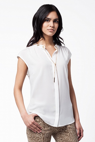 Блузка выполнена из тонкого крепового атласа. Супатная застежка на пуговицы. На верхней стойке люверсы в которые продета золотистая цепь с прямоугольными подвесками на концах. Цепь не прилегает к шее, она проходит внутри стойки. На плечах двойная кокетка, переходящая на спинку, от которой отходит небольшая сборка по центру спинки и полочек.
