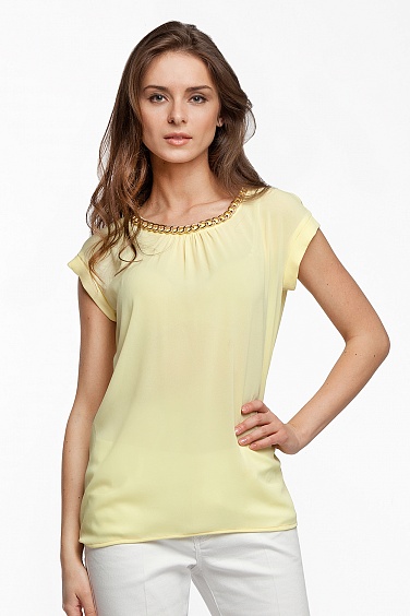 Топ выполнен из тонкой синтетической креповой ткани. На вороте нашита декоративная металлическая золотая цепь. Из под обтачки горловины спереди выходят сборки. Короткий рукав заканчивается манжетой. Сзади потайная молния с золотым бегунком и подвеской.
