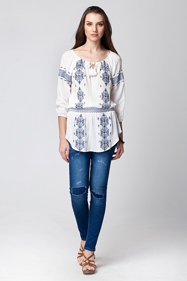 Блузка изготовлена из тонкого фактурного хлопка. Спереди и на рукавах вышивка крестиком. В край горловины вставлена резинка, спереди от выреза отходит кручёный шнур из хлопка с кисточкой на конце. Талия прострочена эластичными нитями, которые собирают ее на сборку. Между строчками зигзагообразным узором проложены синие и голубые нити. Низ рукава на резинке.