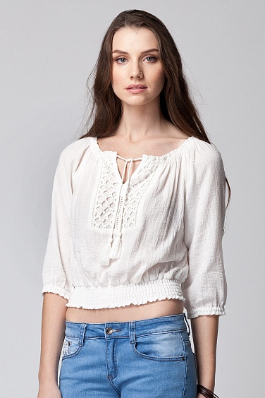 Блузка из тонкой фактурной ткани с лёгким эффектом крэш - марлёвки. Спереди, по обе стороны от разреза горловины нашито широкое кружево. Горловина собрана на резинку, разрез спереди фиксируется хлопковым крученым шнурком с кисточками на концах. По низу блузки простроченный эластичными нитями пояс. Низ рукава на резинке.