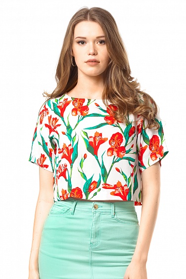Блузка изготовлена из штапельного вискозного полотна с ярким принтом. Горловина обработана обтачкой с изнанки. По низу рукавов и изделия широкая подгибка.