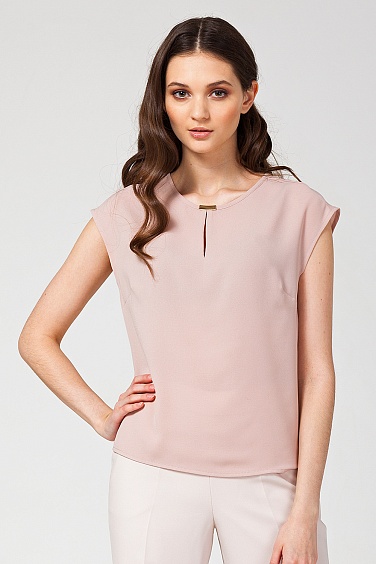 Топ выполнен из матовой пластичной блузочной ткани. Вырез горловины оформлен декоративным золотым прямоугольником, от которого начинается вырез капля. Проймы обработаны окантовками внутри.