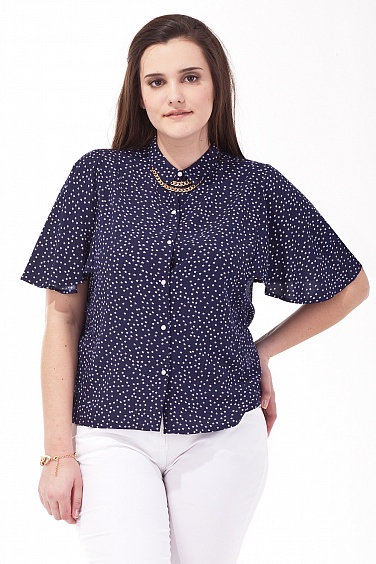 Блузка изготовлена из штапельного вискозного полотна с принтованным рисунком. Рукава выполнены в виде удлиненного крыла. Пластиковые пуговицы.