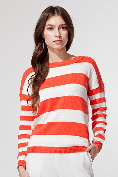 Джемпер изготовлен из хлопковой пряжи вязкой средней плотности. Полосы разной ширины: на полочке и спинке одной ширины, на рукавах - другой. Широкая окантовка горловины связана резинкой , по низу рукавов и изделия так же вязка резинка. Трендовый силуэт спущенной проймы подчеркивает эффектность широких полос.