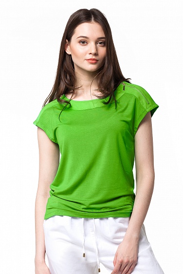 Топ изготовлен из тонкого трикотажного вискозного полотна. По горловине и плечам отделка из декоративной ткани. По плечам золотые молнии. Боковые швы заканчиваются небольшими разрезами, причем спинка длиннее переда.