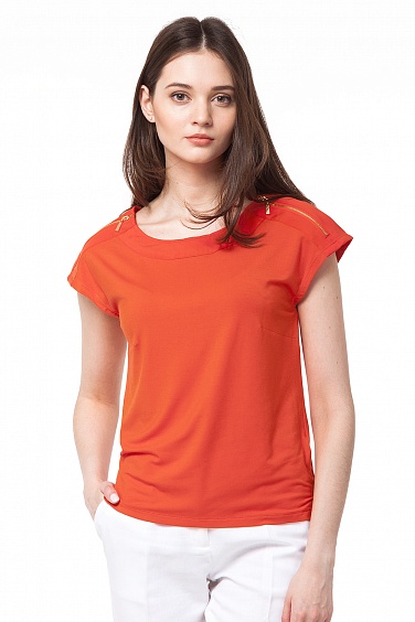 Топ изготовлен из тонкого трикотажного вискозного полотна. По горловине и плечам отделка из декоративной ткани. По плечам золотые молнии. Боковые швы заканчиваются небольшими разрезами, причем спинка длиннее переда.