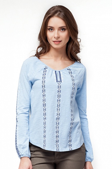 Блузка изготовлена из хлопкового фактурного трикотажа. Спереди и на рукавах принт ввиде вышивки. На горловине вырез-капля и небольшая сборка, закрепленная окантовкой. Низ рукава собран на резинку. Для покупателей детской одежды будет интересно приобрести похожую футболку для девочки F29.099. Популярный family-look!